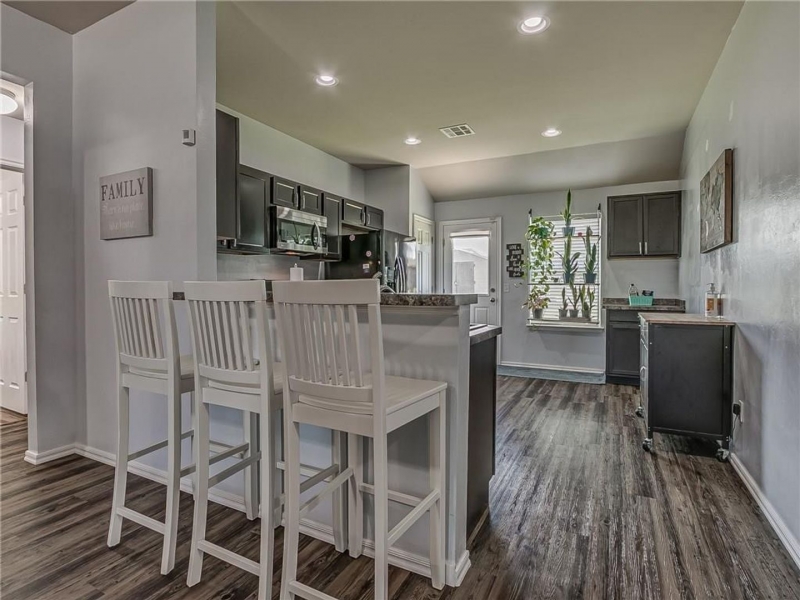 • Kitchen with plenty of storage, gas stove/oven, microwave, built-in dishwasher, breakfast bar, and dining area