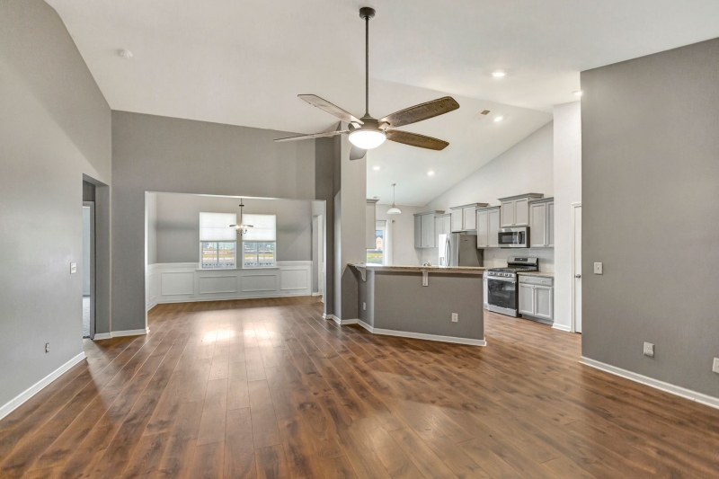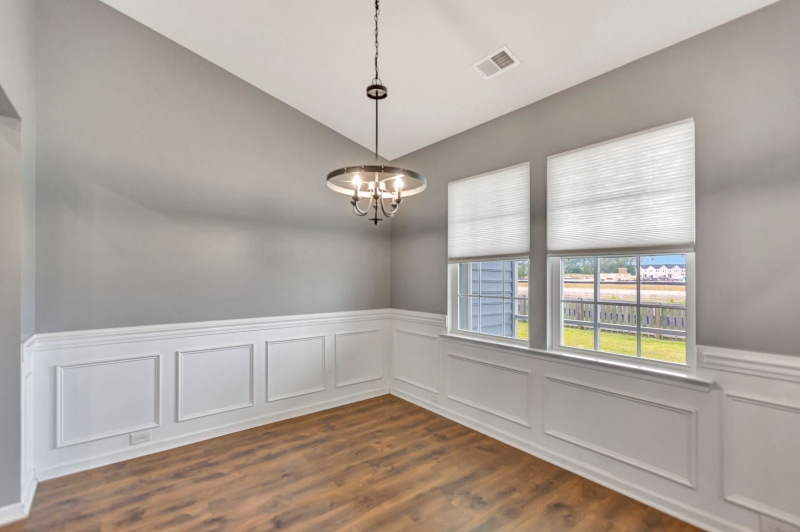 Inside, the home features an open floor plan with vaulted ceilings and durable luxury laminate flooring throughout the main living areas. A formal dining room with elegant wainscoting is perfect for entertaining or hosting family gatherings.