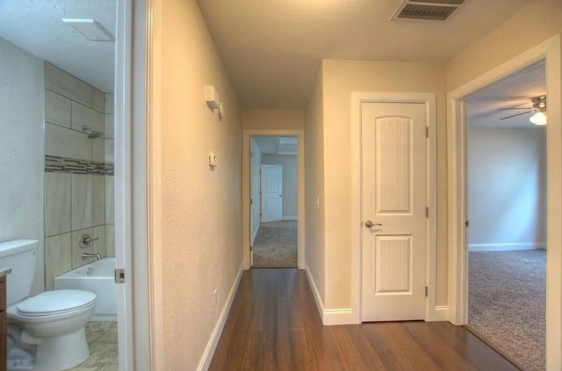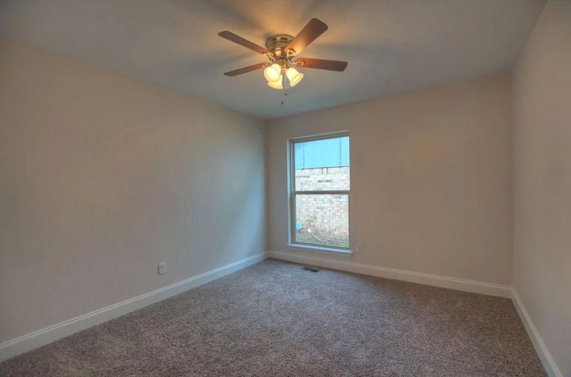 Three of the bedrooms, including the master, are carpeted and equipped with ceiling fans and dimmable lighting for a customizable ambiance. The fourth bedroom showcases bamboo flooring and a stunning floor-to-ceiling built-in shelving feature wall, making it ideal as a home office, formal dining room, game room, or a flexible space to suit your family’s needs.