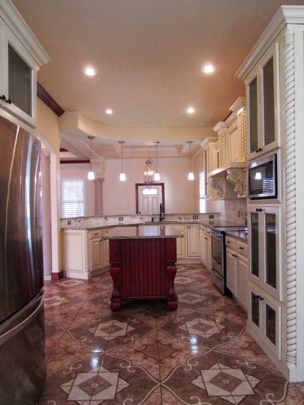 The open living and dining area features a beautiful tray ceiling, while the kitchen offers a cozy breakfast nook and a unique circular granite barβperfect for entertaining.