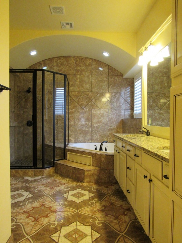 The master suite is filled with natural light and highlighted by an impressive coffered ceiling. The en-suite bathroom includes dual vanities, a custom walk-in shower, a separate soaking tub, and a large master closet that doubles as a safe room with concrete walls and a steel door.