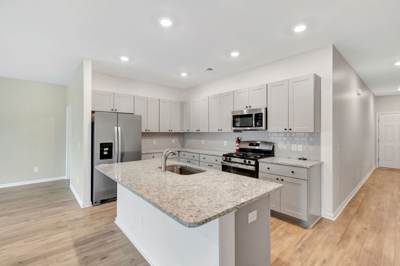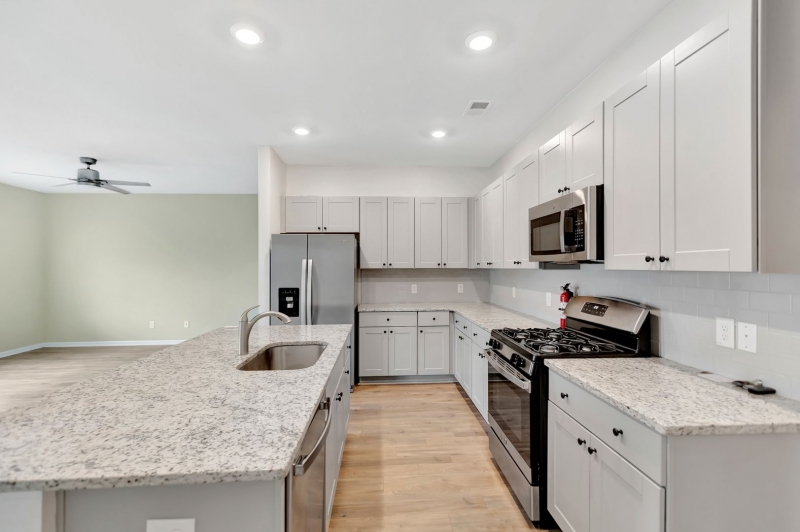 entertaining. At the front of the home, you’ll find two versatile bedrooms, a full bath, and ample storage with both a coat and linen closet. The open-concept kitchen is a true highlight, featuring a large island with seating, sleek shaker cabinets, granite countertops, subway tile backsplash, and stainless steel appliances—including a gas range, built-in microwave, and dishwasher—all overlooking the dining area and great room. The master suite is a peaceful retreat, complete with new LVP flooring, a spacious walk-in closet, dual vanities, and a walk-in shower. Additional conveniences include a dedicated laundry room, a two-car garage with an opener and remotes, a tankless water heater, and upgraded finishes throughout—from wood laminate flooring in the main living areas to tile in baths and laundry.