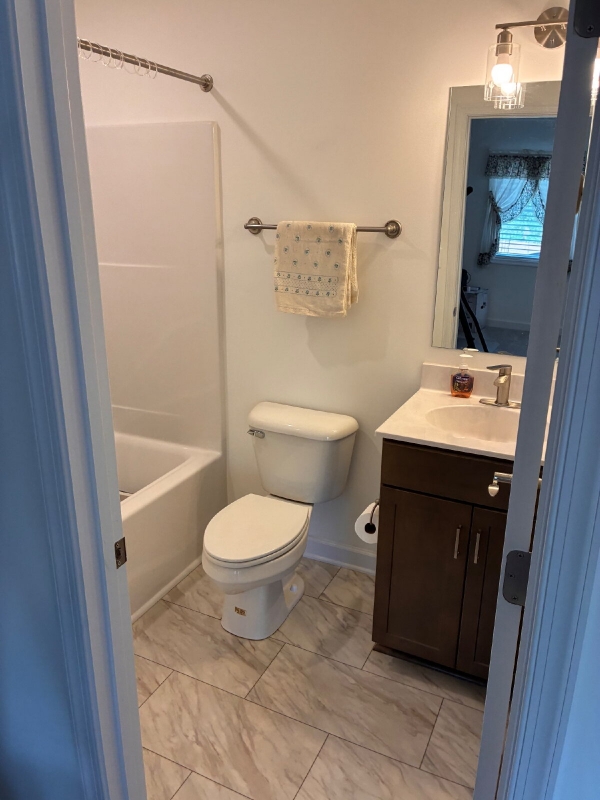 The top level features one of the primary bedrooms, 2 additional bedrooms, a hallway full bath, and laundry room.