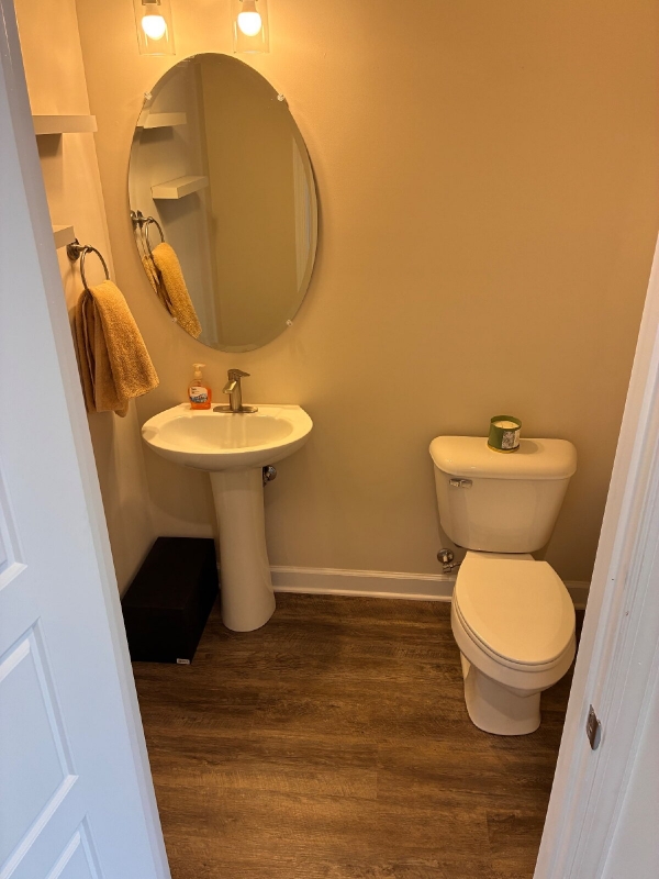 The main living level includes kitchen, dining area, living room and half-bath, with laminate floors throughout and 9-foot ceilings.